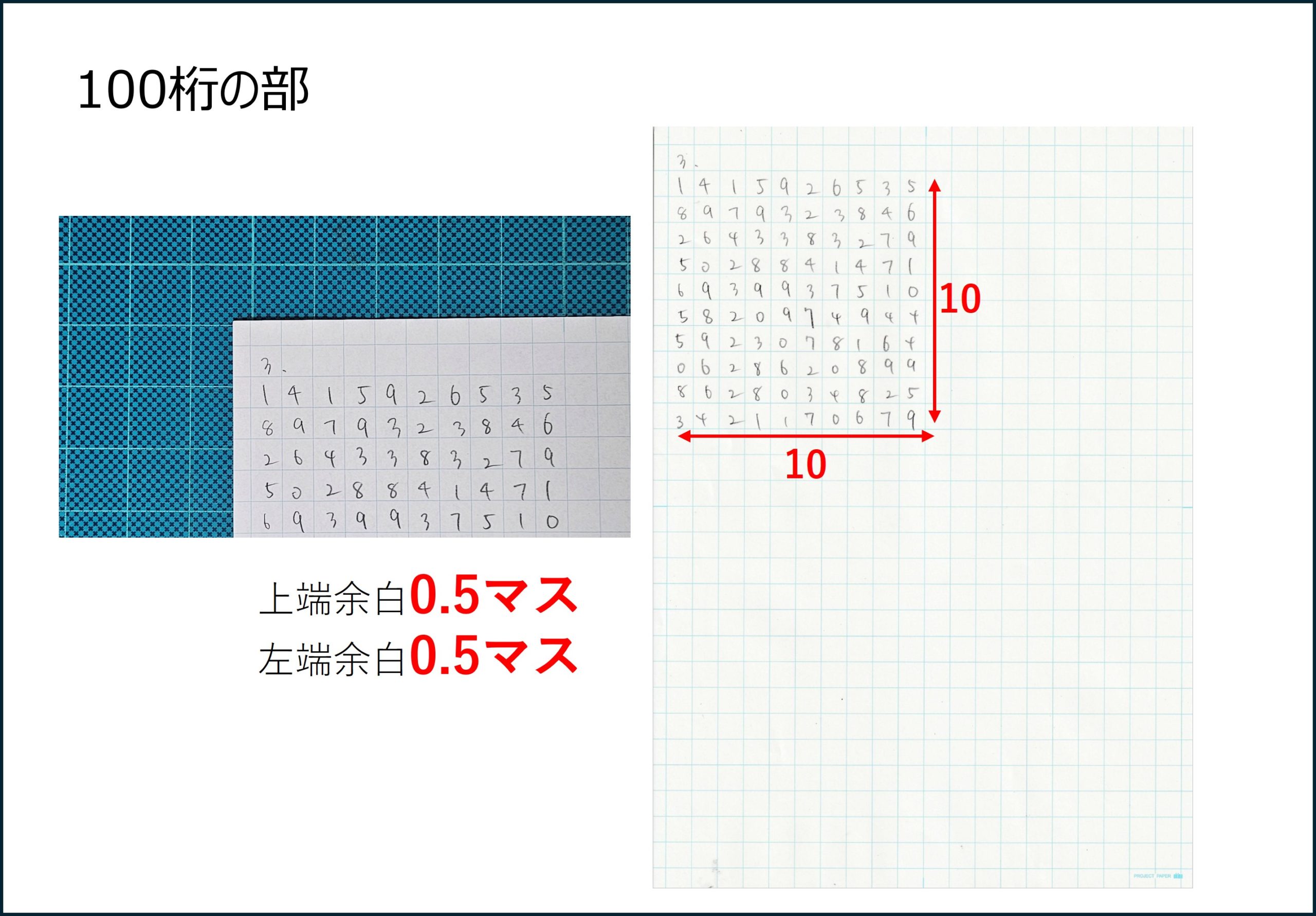 - 方眼紙は縦置きにしてください。10桁ごとに改行してください。