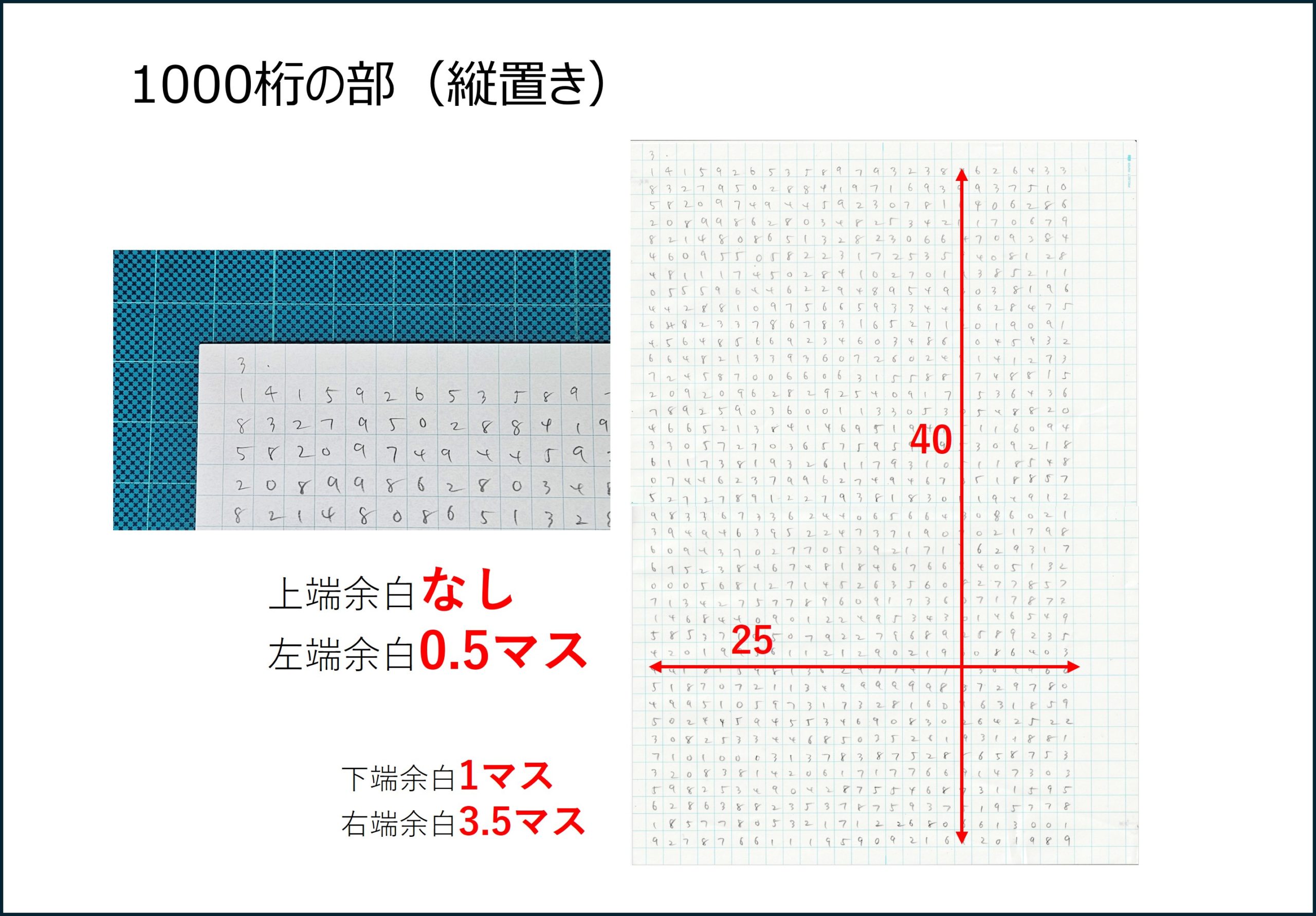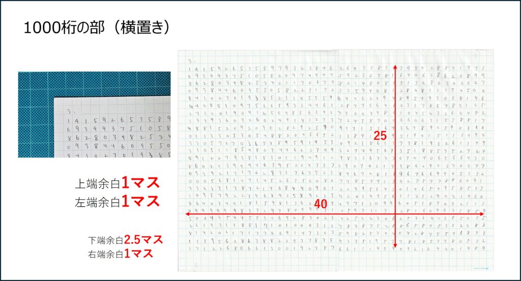 - 採点作業に入ったら、まず自分の方眼紙の空白部分にご自身の氏名を書いてください。採点は競技者相互に行います。採点時には運営事務局が準備する参考資料(100桁、1000桁横置き、1000桁縦置き)をご覧ください。