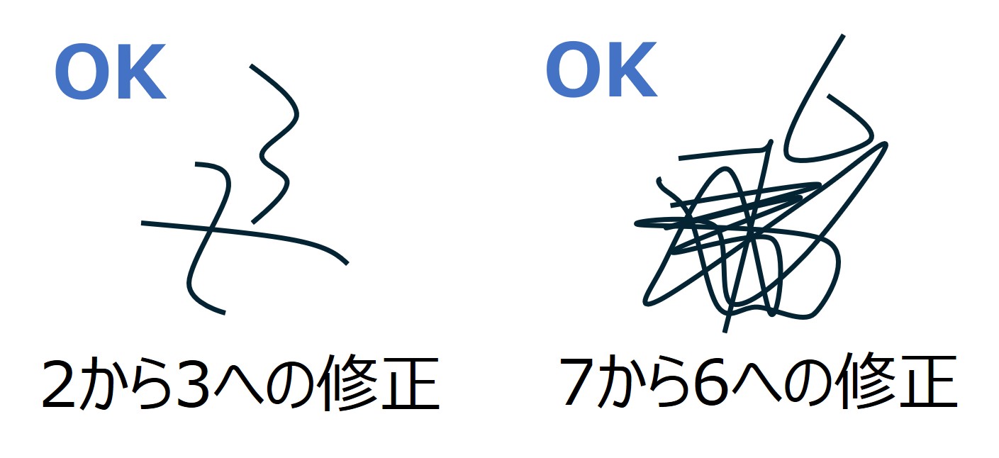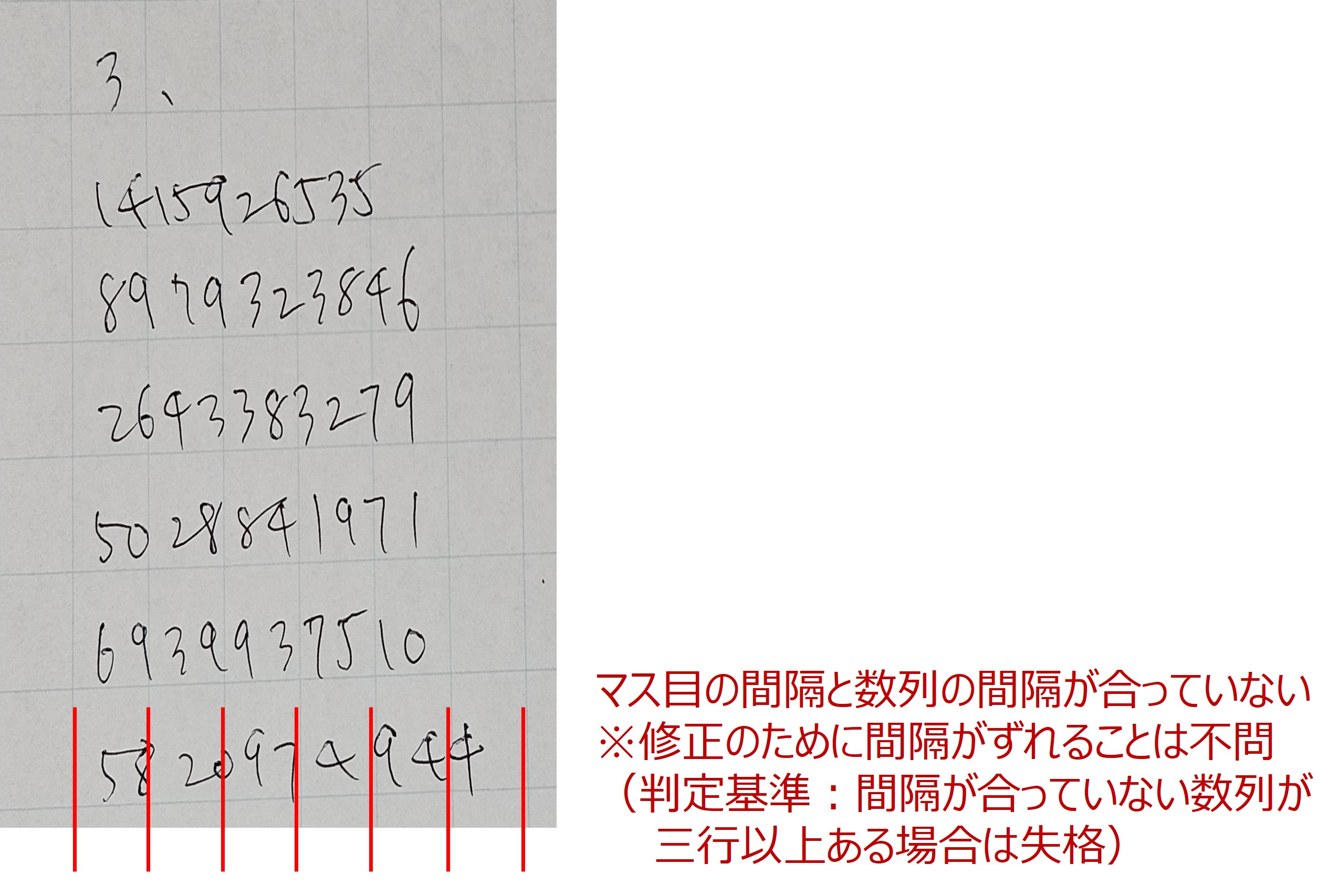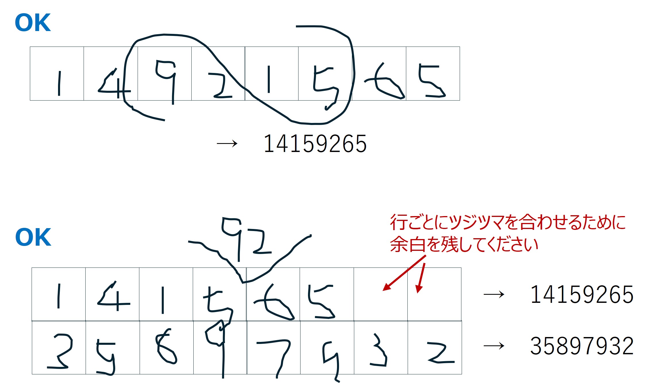 - 基本的にマス目に従って数字を記入していってください。以下のようにマス目を無視した記載は失格となります。