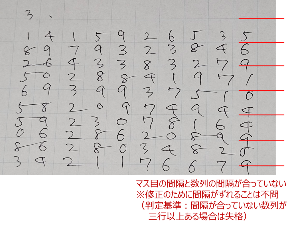 - タイマースタート後、方眼紙に目印となる線やマークを記載しても構いませんが、目印のための数字は記載してはしてはいけません(回答の数と見分けがつかなくなるため)。